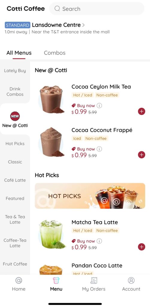 For a limited time, downloading the Cotti Coffee AM app unlocks a bundle of coupons, including a one-time use coupon for any drink at just $0.99 — but you must redeem it within one month of claiming the coupon. Alongside this offer, the app also includes four additional coupons that give you 30% off your purchase. Outside of this promotion, most drinks are still very reasonably priced, with many drink items around $5.99 at Canadian locations (pricing may vary slightly by store).