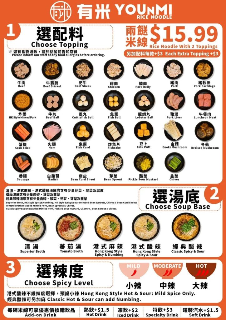 Unlike Yunshang or Meetrice, which focus on pre-set “Crossing the Bridge” style bowls, YouNMi is leaning into the Tam Jai model. It’s all about the order form—you tick off exactly what you want, how spicy you want it, and which broth speaks to you.